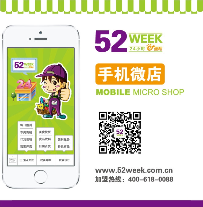 撥打400-618-008加盟熱線或者直接地步留言,加盟52week便利店。